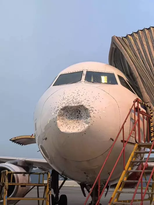 客機降落重慶遇冰雹致玻璃破裂機鼻凹陷 機上147人全部安全。圖片來源:X@FlightModeblog