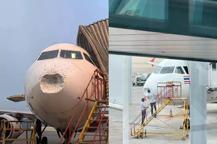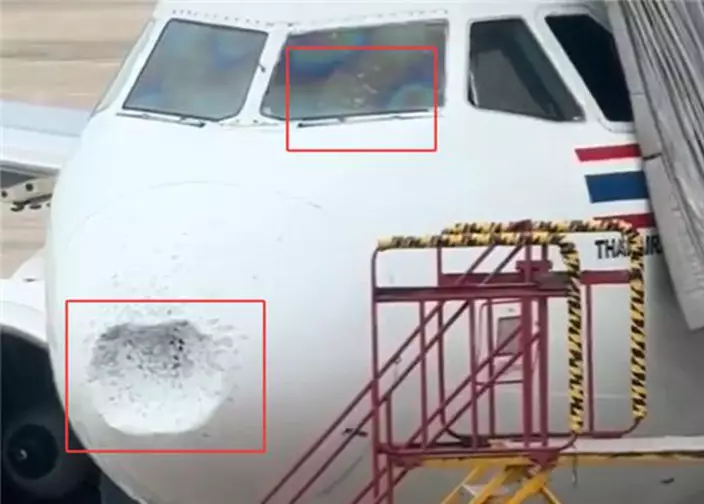 內地傳媒報道,多名網友發圖及片段,指泰國亞洲航空FD552次航班,17日從曼谷廊曼國際機場飛往重慶江北國際機場,降落時遭遇冰雹襲。除了擋風玻璃破裂外,駕駛艙前方機身有一處範圍相當大的凹陷。