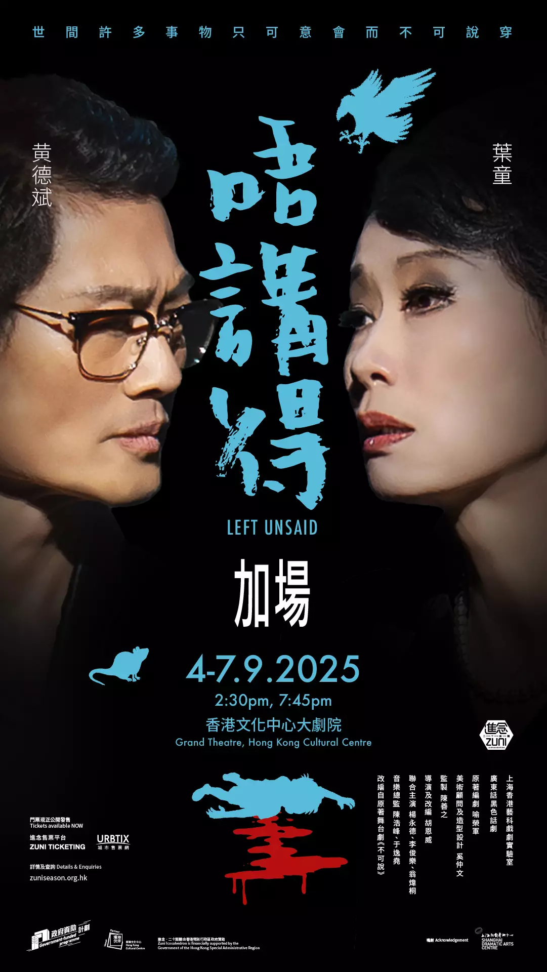 由葉童和黃德斌領銜主演,改編自上海話劇藝術中心原創舞台劇《不可說》的廣東話版黑色喜劇:《唔講得》去年11月於香港文化中心大劇院的首演叫好叫座,早前於吉隆坡及廣州兩地的巡演也獲取了空前成功。《唔講得》將於9月4-7日在香港文化中心大劇院重演,4-6日為夜場晚上7時45分場次,7日為日場下午2時30分場次,票價分別為$680、$480、$280和$180四種。現因觀眾反應熱烈,特別加開9月6日下午2時30分場次,加場門票現已於進念購票平台及城市售票網公開發售。