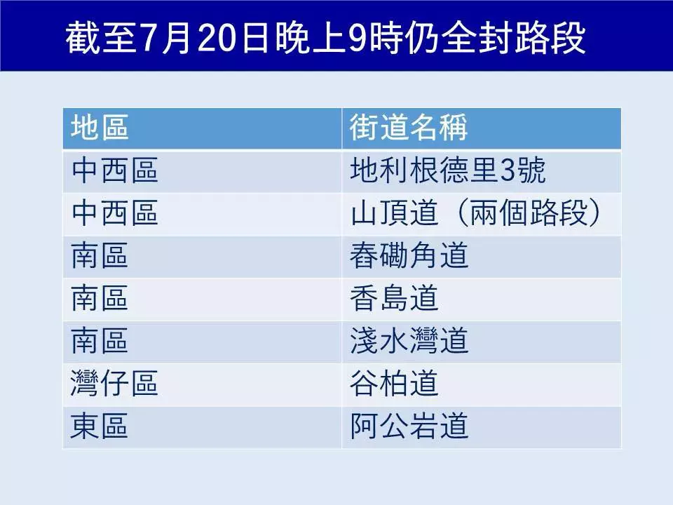 有關巡查工作在今晚7時半完成,大部分受影響的主要道路已恢復正常。截至今晚9時,共有8個受影響路段仍全線臨時封閉。包括中西區的地利根德里3號及山頂道兩個路段、南區舂磡角道、香島道及淺水灣道、灣仔區的谷柏道,以及東區的阿公岩道。