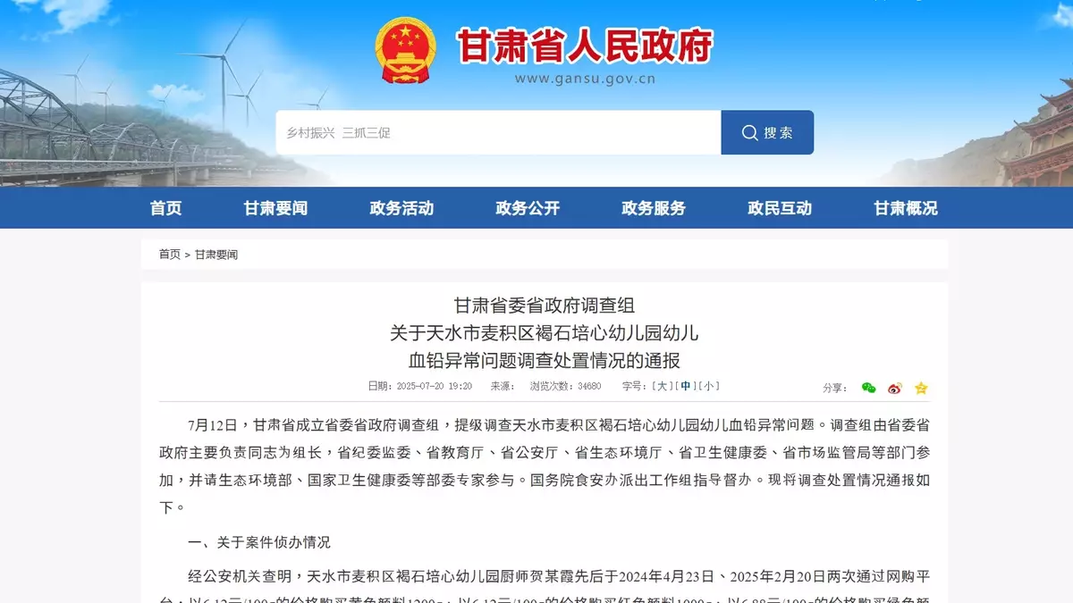 甘肅天水市一間幼兒園被揭發幼兒含鉛量異常的事件,省委省政府為進一步做好後續治療保障工作,已組織兒科、中毒等醫療專家制定後續治療方案,建立患者健康監測檔案,動態掌握康復情況。