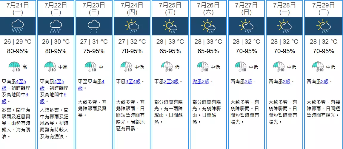 天文台預料,強烈熱帶風暴韋帕的外圍雨帶,星期一(7月21日)繼續會為本港帶來驟雨及狂風雷暴,雨勢有時頗大,海面仍有湧浪,提醒市民請保持警惕,遠離岸邊,並停止水上活動。