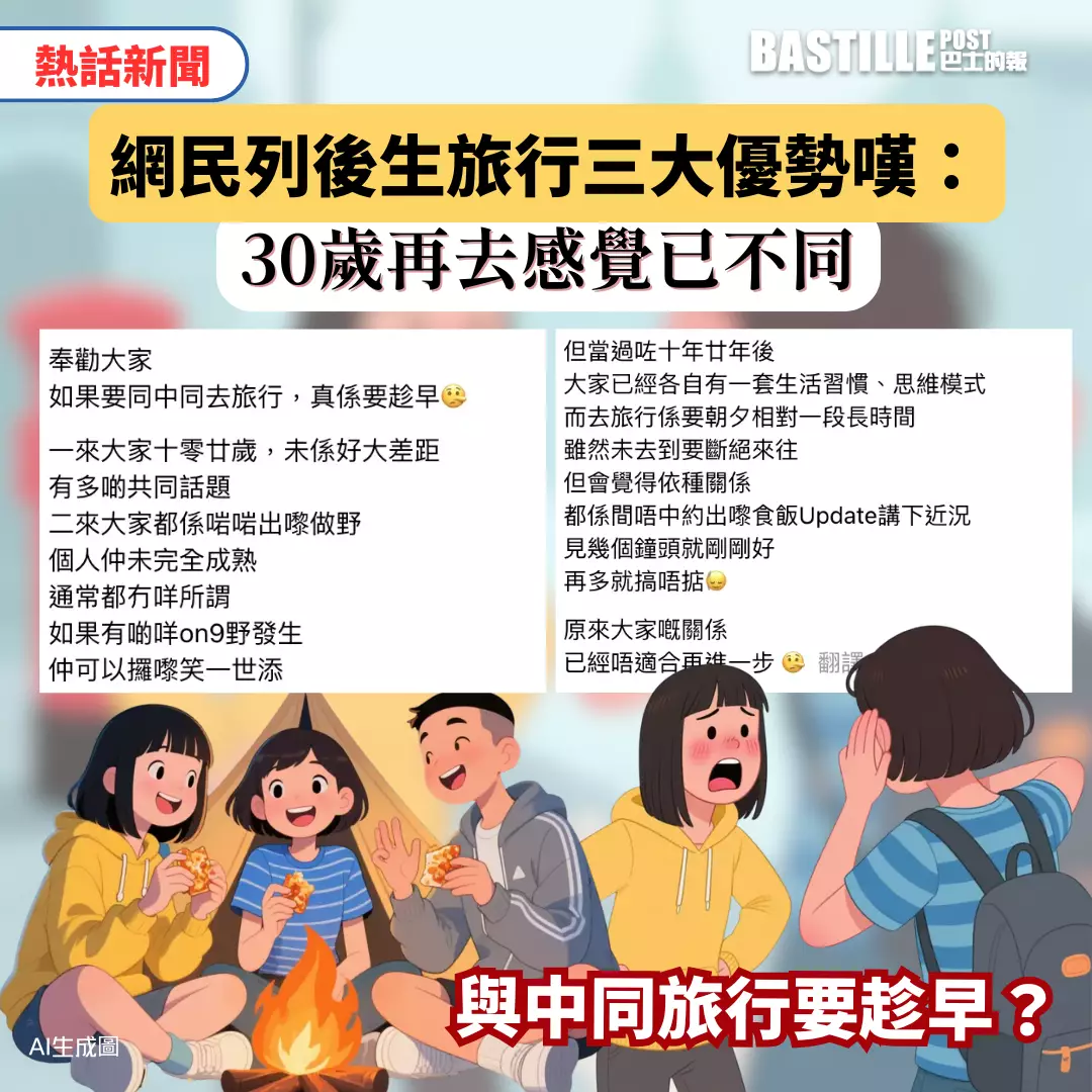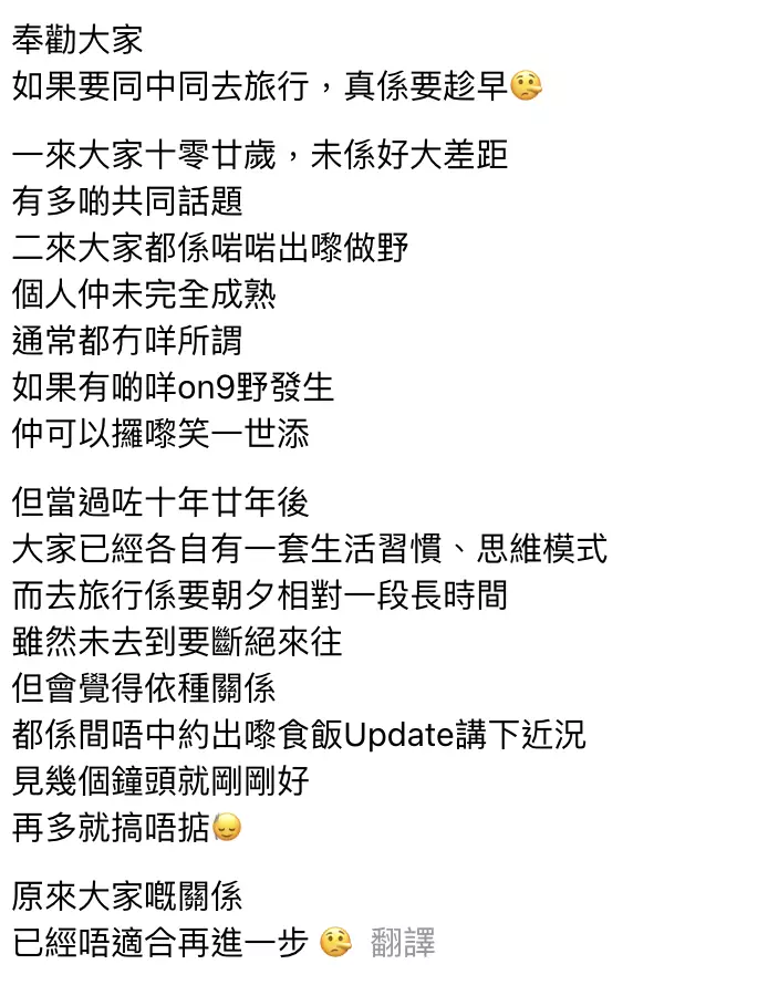 該網民指出,十幾廿歲時與中學同學去旅行有三大好處:大家年齡相近、話題多;剛出來工作時性格未完全定型,相處較隨和,「通常都冇咩所謂」;即使旅途中有不愉快經歷,日後回想起來也能成為笑料。