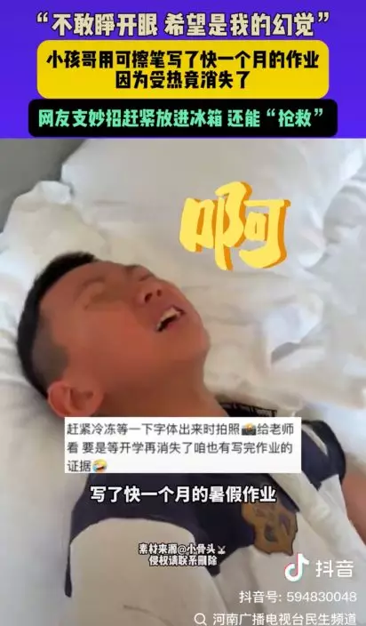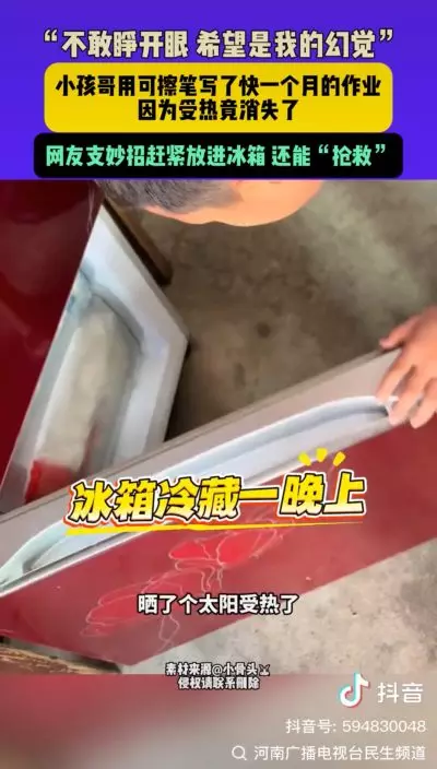 江蘇一名男童用「可擦筆」寫暑期功課,結果遇上酷熱天氣字跡全消失崩潰痛哭,媽媽巧用雪櫃幫助恢復。