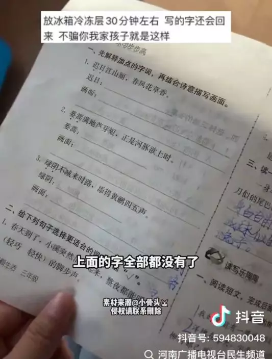 媽媽將功課放入雪櫃助字跡重現。影片截圖