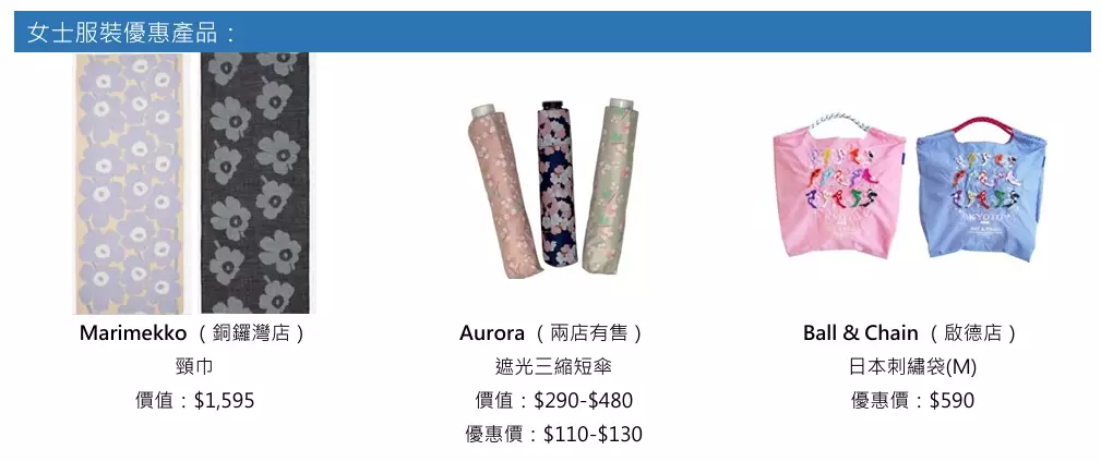 今個夏日,崇光感謝祭為追求品味的女士精心挑選一系列時尚配飾,盡顯優雅魅力。芬蘭設計品牌 Marimekko 的經典印花頸巾,圖案獨特,價值$1,595。此外,Aurora 遮光三縮短傘,設計時尚實用,是晴雨天的最佳伴侶,原價$290-$480,現特價$135起。日本人氣品牌 Ball & Chain的立體刺繡袋工藝細膩,為您的造型增添玩味,優惠價僅售$590,為您的夏日衣櫥添上點睛之筆。