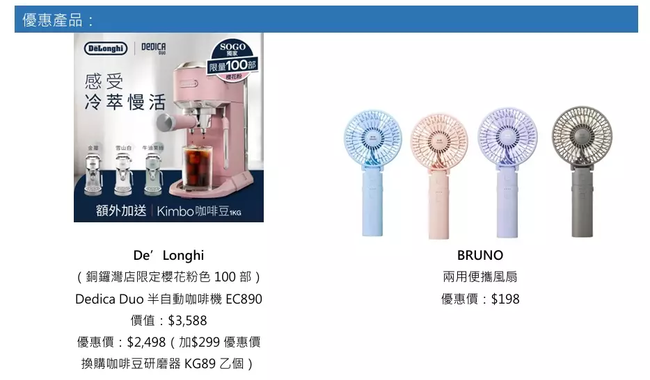 炎炎夏日,崇光百貨為您悉心搜羅一系列優質家品,從味覺到體感,助您驅走悶熱,享受愜意涼夏。全新 De’Longhi Dedica Duo 半自動咖啡機 EC890,為您的居家咖啡體驗帶來革新。其領先的冷萃技術,讓您在約五分鐘內即能享用一杯冰爽甘醇的冷萃咖啡,瞬間消暑。纖巧機身搭載全新觸控介面,完美融入家居,更設有崇光獨家限定櫻花粉色(限量 100 部),為生活增添雅緻品味。優惠價$2,498。由即日起至8月15日,購買該產品更可享限定禮遇,包括Kimbo咖啡豆1 公斤,以及可以$299優惠價換購咖啡豆研磨器KG89乙個。歡迎親臨崇光專櫃,打造專屬於您的品味夏日。