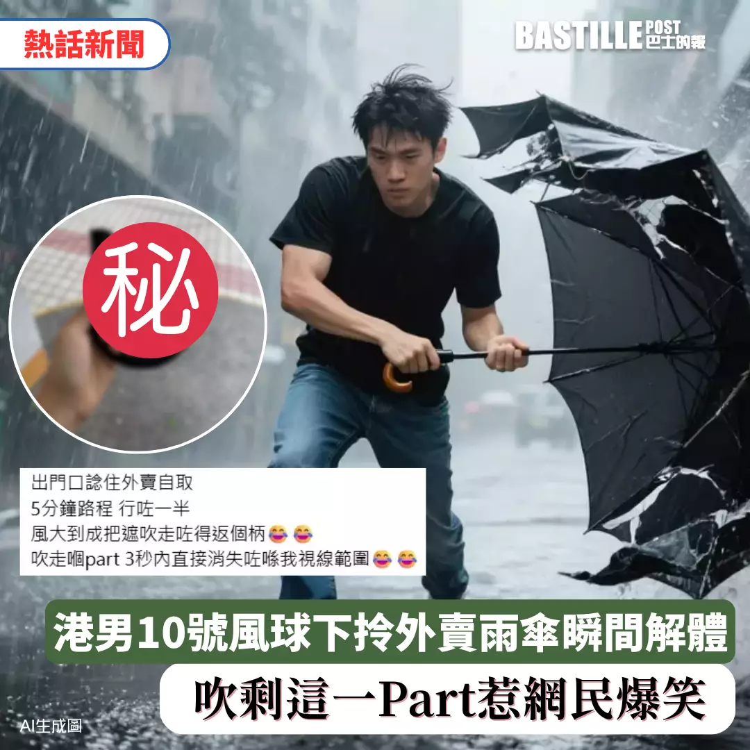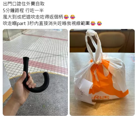 樓主在剛過去的星期日(7月20日),即是天文台改掛10號風球當日,在threads發文分享,指自己出門口到餐廳自取外賣,怎料5分鐘路程只走了一半,手上的傘被狂風吹走,剩下傘柄。他自己都無奈地給了兩個哈哈笑的emoji,更搞笑地說「吹走嗰part,3秒內直接消失咗喺我視線範圍」不過幸好的是,雖然大風吹走把傘,但人和外賣都安全回家。