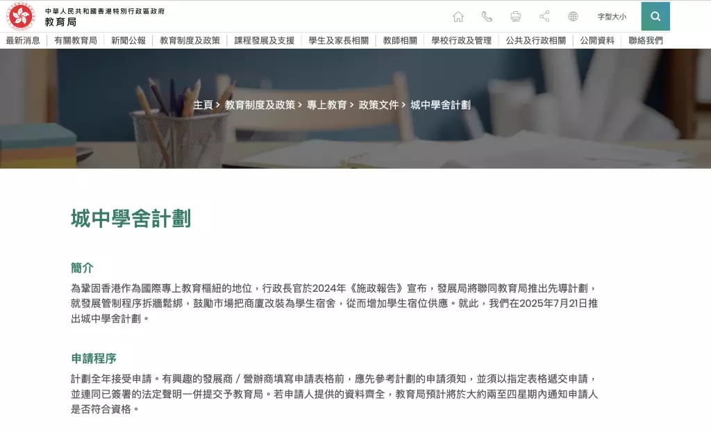 發展局與教育局宣布「城中學舍計劃」開始接受申請。計劃鼓勵市場以自資和私營方式把整幢商廈改裝成學生宿舍,在符合指定條件下亦容許局部改裝。政府期望為發展管制程序拆牆鬆綁,增加宿位供應,鞏固香港作為國際專上教育樞紐的地位。