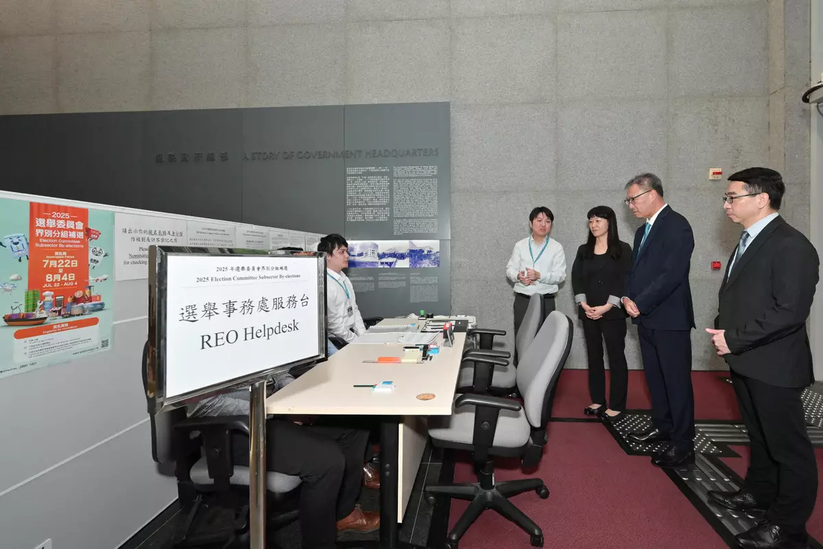 選舉管理委員會主席陸啟康法官到訪位於添馬政府總部接收二○二五年選舉委員會界別分組補選提名表格的選舉主任辦事處。圖示陸啟康法官(右二)在選舉事務處總選舉事務主任陳淑華(右三)及首席選舉事務主任(選舉)陳志成(右一)陪同下,視察場地的準備情況。政府新聞處