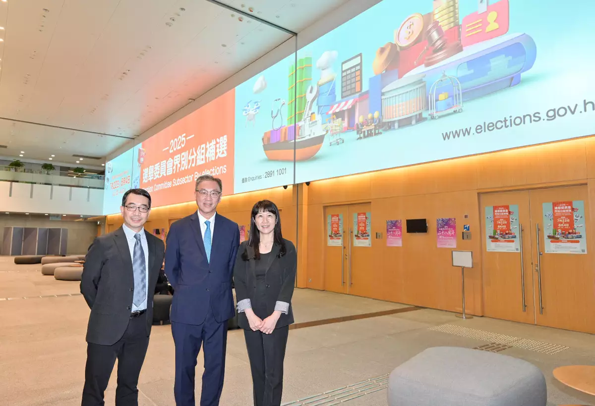選舉管理委員會主席陸啟康法官到訪位於添馬政府總部接收二○二五年選舉委員會界別分組補選提名表格的選舉主任辦事處。圖示陸啟康法官(左)在選舉事務處總選舉事務主任陳淑華(中)及首席選舉事務主任(選舉)陳志成(右)陪同下,視察公眾查閱提名表格的安排。政府新聞處