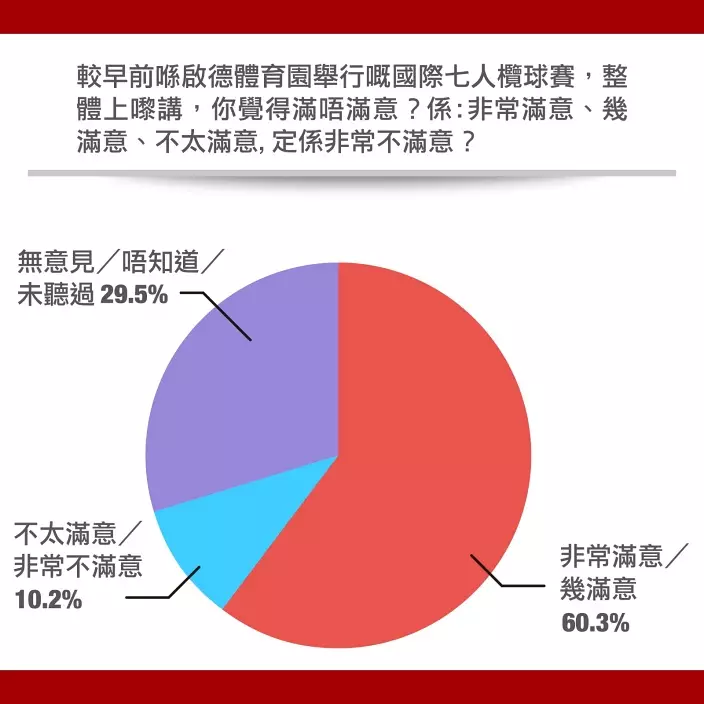 至於較早前在啟德體育園舉行的國際七人欖球賽,市民整體上是否滿意,結果顯示,有共60.3%的受訪者表示滿意,包括5.8%指「非常滿意」、「幾滿意」的則有54.6% ;而表示不滿意的共僅約1成,當中「不太滿意」佔9.4%,而「非常不滿意」則只有0.8%;而表示「無意見/唔知道/未聽過」的則有29.5%。