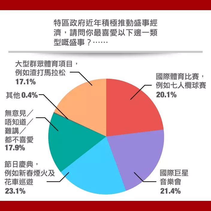 對特區政府近年積極推動盛事經濟,調查結果顯示,市民排第一最喜愛的盛事類型首推「節日慶典」,有23.1%人都選擇如新春煙火及花車巡遊的節日慶祝活動,其中 62.6% 女性都選此項,明顯較37.4%的男性為多;亦較多60歲或以上市民認同,佔49.4%。