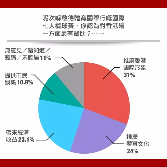 對啟德體育園舉行如國際七人欖球賽等國際事賽,對香港哪一方面最有幫助,結果顯示,受訪者認為對「推廣香港國際形象」最有禆益,佔31%;而認為對「推廣體育文化」和「帶來經濟收益」則各有千秋,分別佔24%和23%;而認為是提供市民娛樂的則有10.9%;表示「無意見/唔知道/難講/未聽過」的則有11%受訪者。 換言之有9成市民認同啟德體育園搞體育盛事有正面作用。