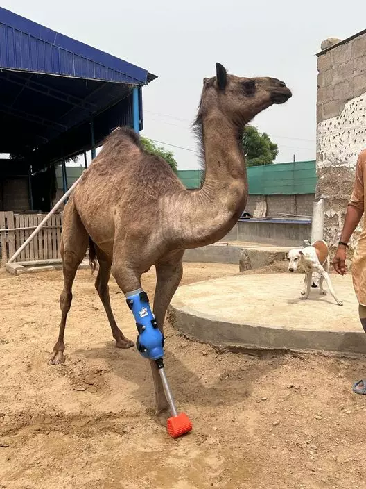 巴基斯坦一隻只有8個月大的小駱駝誤闖私人地方,慘遭打斷腳,獸醫為牠安上義肢,成功助牠重新站起來並走路。