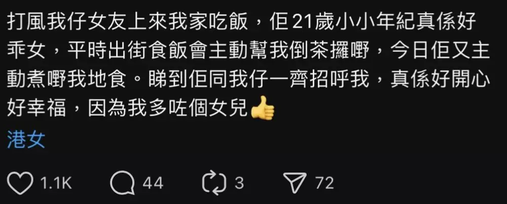 有網民指當日打風,兒子的21歲女友到自己家中作客。他讚兒子女友雖然「小小年紀」,但「真是乖女兒」,因為平時外出吃飯都會主動幫uncle「倒茶攞嘢」,而打風日來到「又主動煮東西」給長輩吃。原帖主看到兒子與女友一起招呼自己,覺得「真係很開心很幸福」,因為她感覺像「多咗個女兒」。