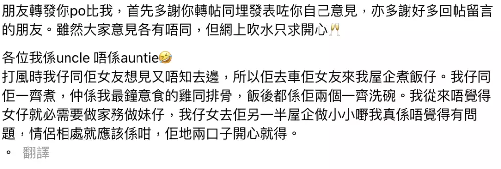 沒想到反擊文引來原帖主回應!原帖主表示,當日打風兩小口不知去哪,才到自己家煮飯仔,飯後是「兩個一齊洗碗」。他「從來唔覺得女仔就必需要做家務做妹仔」,若果自己仔女去另一半屋企做小小事,亦「唔覺得有問題」,認為「情侶相處就應該係咁」。