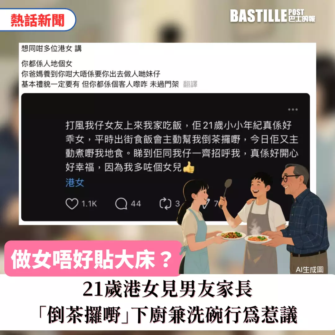 早前香港打風,有網民發帖分享,當日自己兒子女友冒雨到家中作客,不僅親自下廚,更與兒子一同「招呼」自己,令事主感動直呼「多咗個女」,但沒想到該港女做法卻惹來網民熱議!