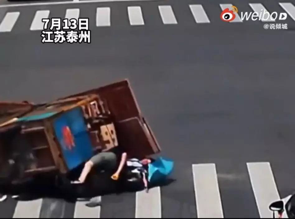綜合內媒報導,江蘇泰州泰州姜堰區南京路與馬廠路交界於7月13日發生一宗交通意外,一輛載有廢木料的電動三輪車與電單車相撞後發生側翻,導致電單車上1名男子及2名年僅5至6歲的兒童被壓於重達800斤的車身及帶釘木板下,情況危急。
