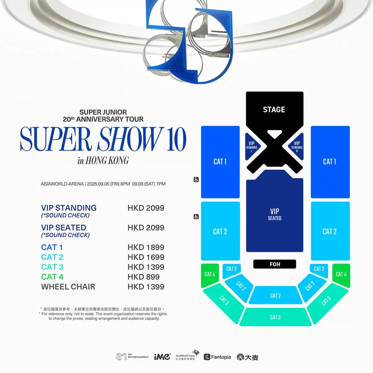 韓國傳奇男團Super Junior(SJ)將於2025年9月5日(週五)晚上8點及9月6日(週六)晚上7點,在香港亞洲國際博覽館(AsiaWorld-Arena) 舉辦「SUPER JUNIOR 20th Anniversary TOUR SUPER SHOW 10 in HONG KONG」,作為其20週年紀念世界巡迴演唱會的一部分。7月22日中午12點開放的E.L.F.會員預售門票,在短短5分鐘內已顯示全數售罄,展現了Super Junior在香港的超高人氣。公開發售將於7月23日(週三)中午12點正式開始,預計將掀起另一波搶票熱潮。