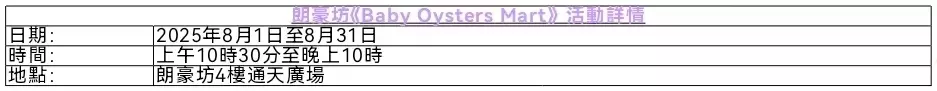 憑著天真無邪的外表,Baby Oysters近年火速爆紅,成為深受粉絲和消費者喜愛的人氣角色。早前日本東京推出的主題商品更一度掀起搶購熱潮,惹來粉絲們的追捧狂潮。今次朗豪坊《Baby Oysters Mart》將多個打卡場景、獨家限定精品展示及互動遊戲融合,打造一場充滿儀式感的體驗。