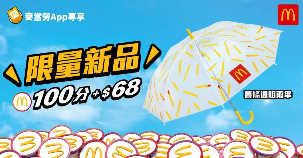 雨季必備!麥當勞App推出全新薯條透明雨傘 只需100積分加$68即可換購