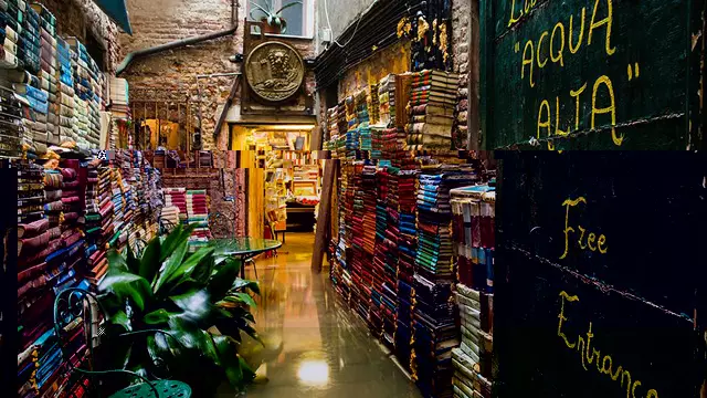 不知能否算是世界上唯一的水下書店,水位上漲時老闆還不得不把所有的書搬到更高的架子上。當威尼斯發洪水時,人們在大街上涉水玩耍,所有的建築物都用木板圍上,Libreria Acqua Alta書店依舊正常營業,似乎水也是書店的組成之一。