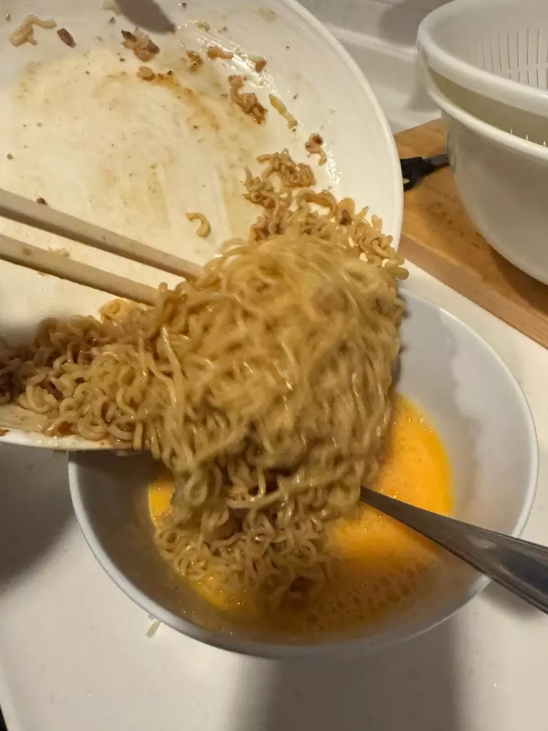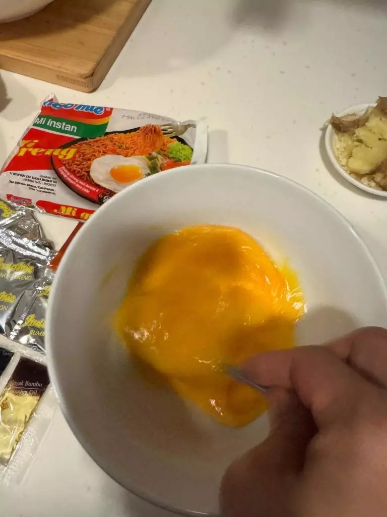 根據該網友分享的做法,有別於一般煮熟拌調 味料即食的方式,印尼姐姐會先將雞蛋打散,把已煮好並拌勻調味的撈麵放進蛋液中,確保每條麵條均掛上蛋液後,再入鍋煎香,待兩面金黃即可起鍋,最後拌上ABC辣醬,成功達到「飽腹感++」,該網友又指,印尼姐姐指,若想口感更豐富,可添加椰菜一同煎香。