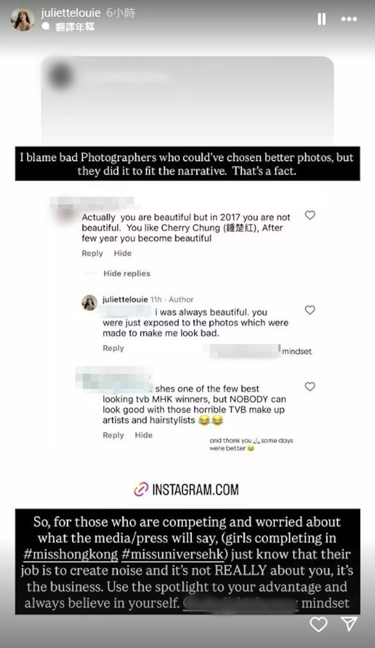 31歲的2017年港姐冠軍兼「最上鏡小姐」雷莊𠒇(Juliette),卸任後雖返回加拿大發展,但仍活躍於選美界,不時在社交平台分享生活。