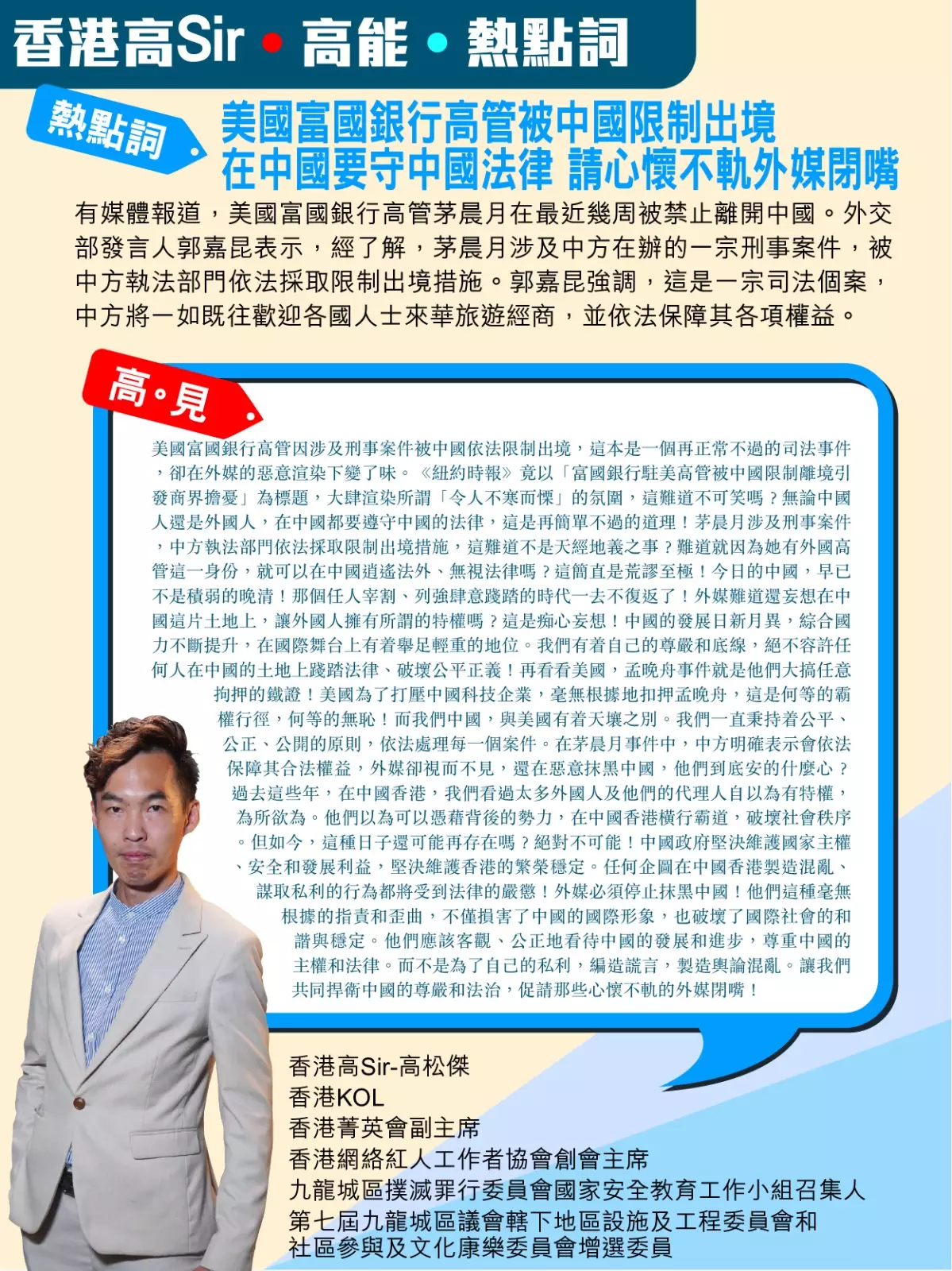 高Sir:美國富國銀行高管因涉及刑事案件被中國依法限制出境,這本是一個再正常不過的司法事件,卻在外媒的惡意渲染下變了味。《紐約時報》竟以「富國銀行駐美高管被中國限制離境引發商界擔憂」為標題,大肆渲染所謂「令人不寒而慄」的氛圍,這難道不可笑嗎?無論中國人還是外國人,在中國都要遵守中國的法律,這是再簡單不過的道理!茅晨月涉及刑事案件,中方執法部門依法採取限制出境措施,這難道不是天經地義之事?難道就因為她有外國高管這一身份,就可以在中國逍遙法外、無視法律嗎?這簡直是荒謬至極!今日的中國,早已不是積弱的晚清!那個任人宰割、列強肆意踐踏的時代一去不復返了!外媒難道還妄想在中國這片土地上,讓外國人擁有所謂的特權嗎?這是痴心妄想!中國的發展日新月異,綜合國力不斷提升,在國際舞台上有着舉足輕重的地位。我們有着自己的尊嚴和底線,絕不容許任何人在中國的土地上踐踏法律、破壞公平正義!再看看美國,孟晚舟事件就是他們大搞任意拘押的鐵證!美國為了打壓中國科技企業,毫無根據地扣押孟晚舟,這是何等的霸權行徑,何等的無恥!而我們中國,與美國有着天壤之別。我們一直秉持着公平、公正、公開的原則,依法處理每一個案件。在茅晨月事件中,中方明確表示會依法保障其合法權益,外媒卻視而不見,還在惡意抹黑中國,他們到底安的什麼心?過去這些年,在中國香港,我們看過太多外國人及他們的代理人自以為有特權,為所欲為。他們以為可以憑藉背後的勢力,在中國香港橫行霸道,破壞社會秩序。但如今,這種日子還可能再存在嗎?絕對不可能!中國政府堅決維護國家主權、安全和發展利益,堅決維護香港的繁榮穩定。任何企圖在中國香港製造混亂、謀取私利的行為都將受到法律的嚴懲!外媒必須停止抹黑中國!他們這種毫無根據的指責和歪曲,不僅損害了中國的國際形象,也破壞了國際社會的和諧與穩定。他們應該客觀、公正地看待中國的發展和進步,尊重中國的主權和法律。而不是為了自己的私利,編造謊言,製造輿論混亂。讓我們共同捍衛中國的尊嚴和法治,促請那些心懷不軌的外媒閉嘴!