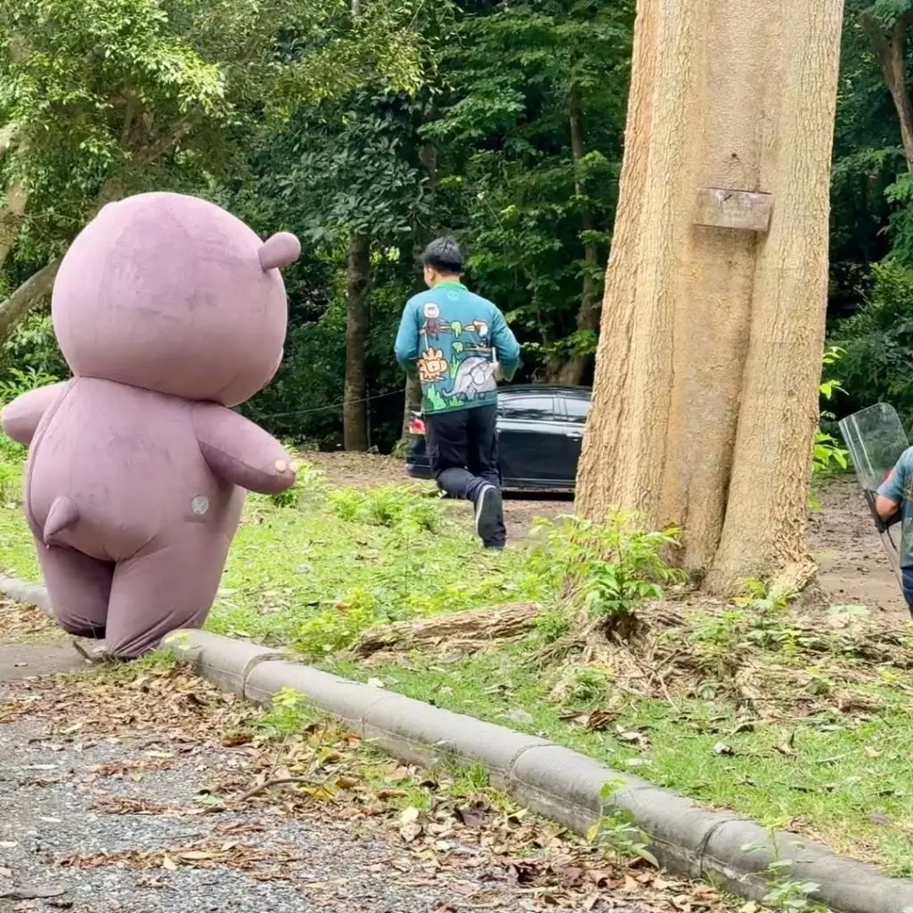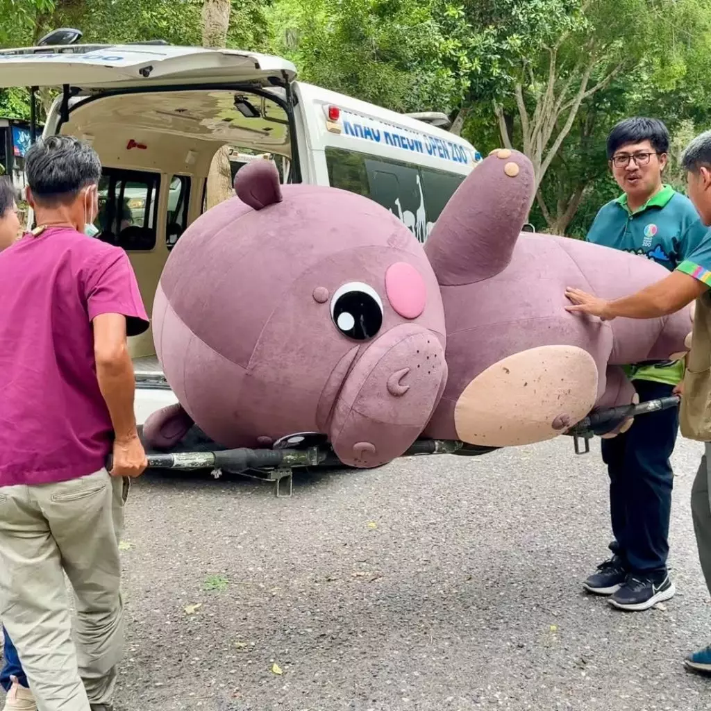 泰國一間動物園利用其最著名的動物侏儒河馬「彈跳豬」(Moo Deng) 的造型吉祥物進行演習,以測試管理員的反應。