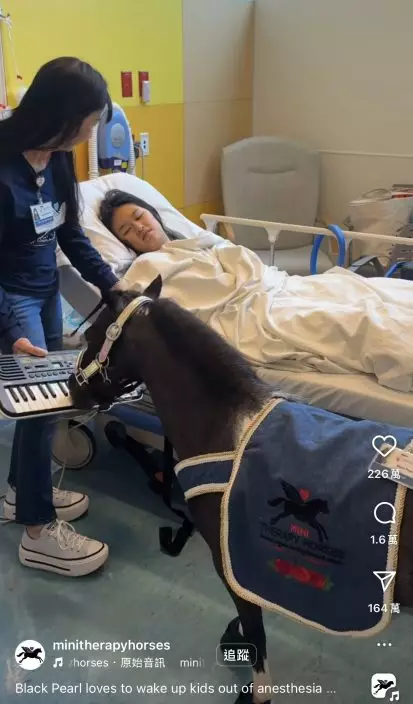 7月21日,Mini Therapy Horses於官方Instagram分享了一段迷你馬「黑珍珠」(Black Pearl)陪伴病童的短片,引發全球熱議。影片中,「黑珍珠」用嘴巴「彈奏」玩具鋼琴,神態專注又滑稽,而病床上的女童則靜靜注視著牠的表演,原本略顯疲憊的臉龐逐漸展現笑容。