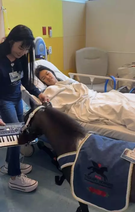 美國一隻迷你治療馬於病房用嘴「彈琴」療癒病童,憑專注又滑稽的神態爆紅全球。