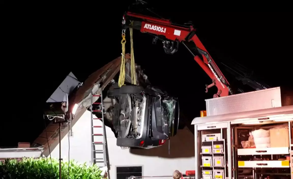 離奇車禍!德國私家車突失控衝入花園撞飛男童,之後插在約3米高的穀倉屋頂上,事故釀成6人受傷。