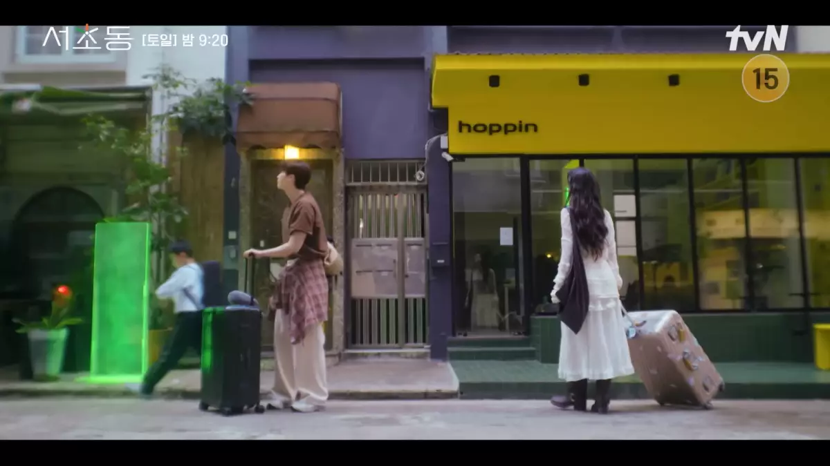 二人在電梯旁的民宿外相遇。tvN影片截圖