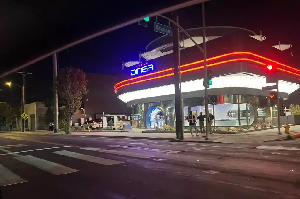 First look at Tesla's completed Hollywood diner and Supercharger! It looks sick! Really dope futuristic/retro vibe.