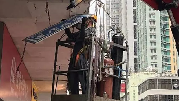 屋宇署發現並處理40宗涉及鬆脫招牌、棚架或窗戶帶來安全隱患而需要跟進的個案。(發展局社交網站圖片)