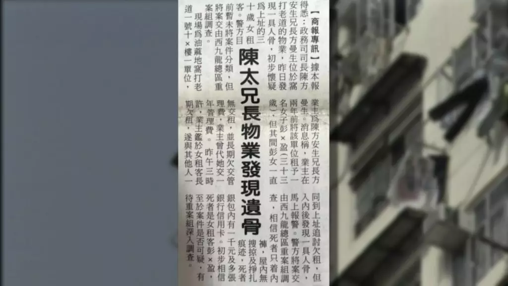 1999年10月,失聯四年的前模特兒彭楚盈,其骸骨於油麻地華德大廈被發現,單位屬於前政務司司長陳方安生兄長方曼生,由於方彭二人有親密關係,事件轟動全城!案件原本循兇殺方向調查,最終警方認為死因無可疑,未有召開死因聆訊下於2001年結案。死者親屬多番努力爭取開死因庭,直至時任律政司司長黃仁龍介入,死因庭在2006年展開,最終裁定彭死於不幸或意外,惟事件至今依然留下大量謎團。
