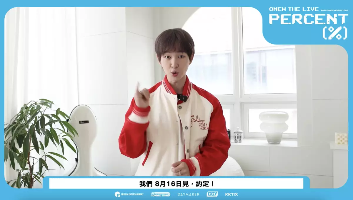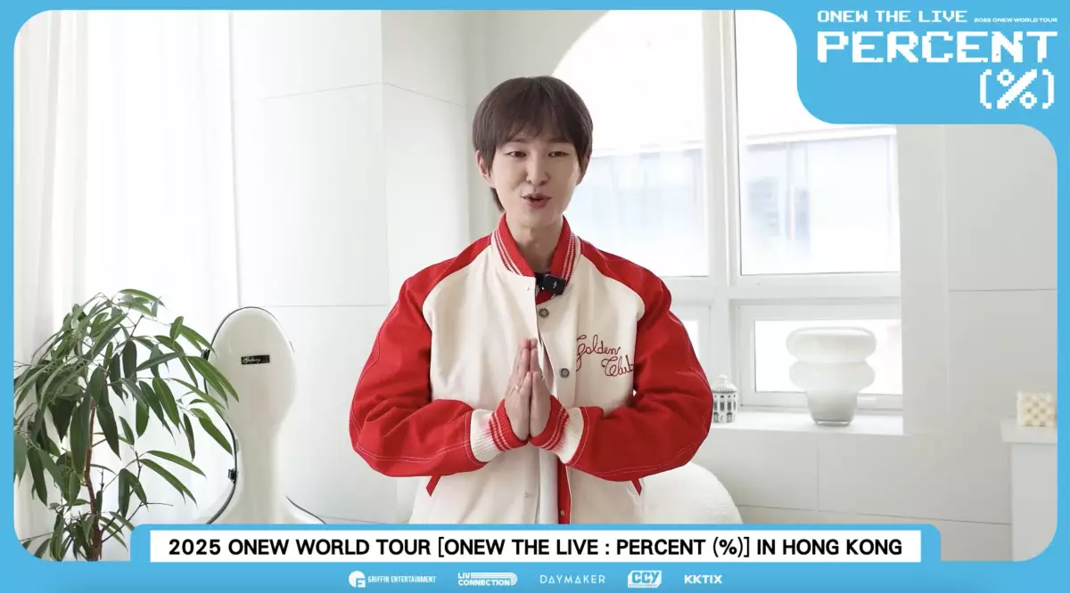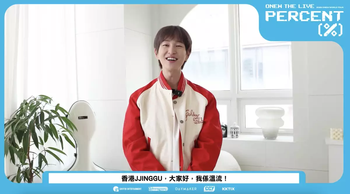 因為,溫流要正式宣佈他的世界巡演資訊,同時間更輕拍手掌加強氣氛:「《2025 ONEW WORLD TOUR [ONEW THE LIVE : PERCENT (%)] IN HONG KONG》於8月16日在東蒲胡李名靜體育館和大家見面。」表情相當可愛。而ONEW也談及他的近況:「我努力地在準備不同的表演給大家,很期待和香港JJINGGU見面!」訴說自己的心情。最後,當然要約定歌迷:「我們8月16日見,約定!」並做出勾手指的動作。正當觀眾們以為影片完結之際,溫流再以廣東話補充:「到時見!」最後揮手向粉絲道別。