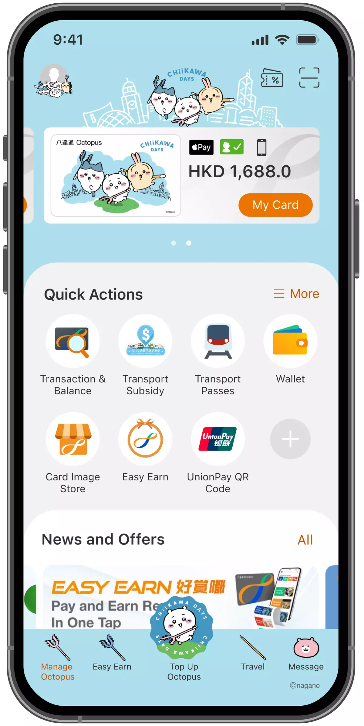 手機八達通用戶亦可於八達通App「八達通卡面商店」選購另外兩款白天或黑夜主題卡面。購買後,每次使用手機八達通付款均可見到CHIIKAWA DAYS卡面,Chiikawa與好友更會出現在八達通App的啟動畫面及主頁介面。