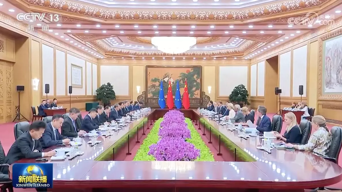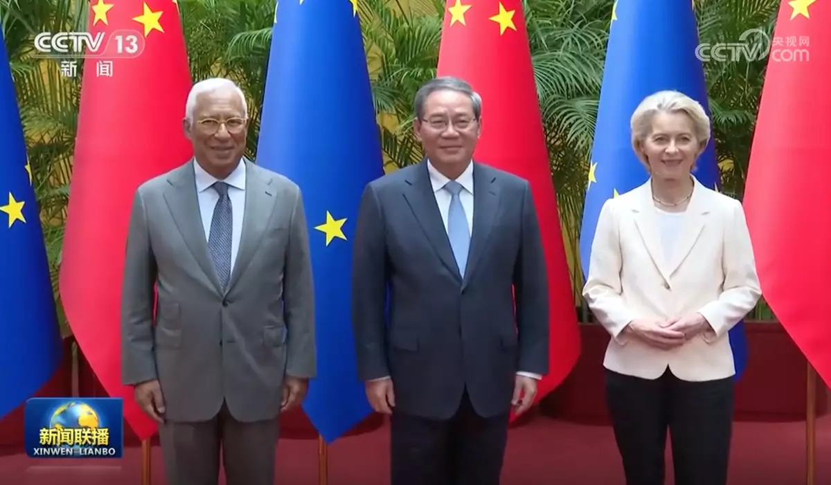 國務院總理李強在北京人民大會堂,同歐洲理事會主席科斯塔及歐盟委員會主席馮德萊恩,共同主持第25次中國-歐盟領導人會晤。