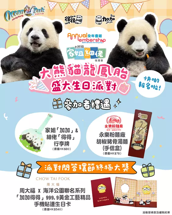 公園誠邀大家與摯愛親朋一同投入大熊貓龍鳳胎寶寶加加和得得一歲生日慶典,共創「只此一次」的永恆回憶,並以行動支持海洋公園的保育工作。更多詳情,請瀏覽海洋公園官方網站