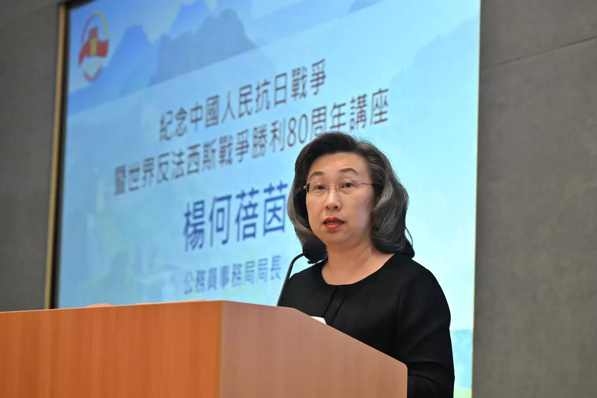 楊何蓓茵在開場發言鼓勵公務員加深認識抗日戰爭的歷史及其重要意義,深刻體會中國人民自強不息的精神和維護國家安全的重要性。政府新聞處圖片
