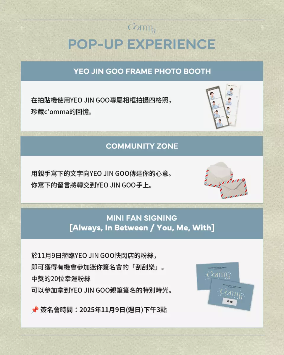 更特別的是,11月9日將舉辦迷你簽名會《Always, In Between / You, Me, With》,當天20名幸運兒,現場透過「刮刮卡」確認中獎,可以拿到呂珍九的珍貴親筆簽名。此外,另有HIAND App預先活動「拍立得攝影」,加入呂珍九專屬社群並認證者,抽選5名於現場與呂珍九進行拍立得合照。快閃店免費入場、無需預約,11月7-9日計劃造訪聖水洞的各位,記得把握機會與呂珍九近距離互動!此前,呂珍九曾透過親筆信表示:「入伍前能與粉絲面對面微笑交談的每刻,都將成為珍貴回憶。暫別期間,我會成為更堅強成熟的人回來!」