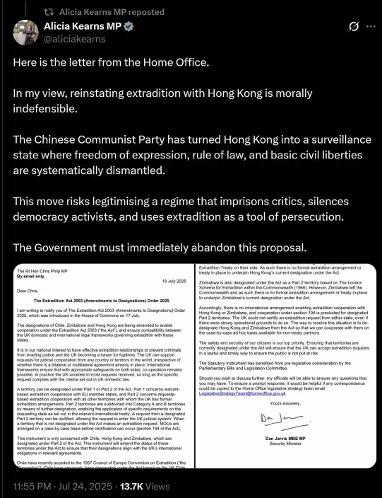 據報道,英國保守黨議員、下議院外交事務委員會前主席凱恩斯(Alicia Kearns)於英國時間周四(24日)下午,公開英國政府準備修改《2003 年引渡法(指定第二部法域)指令》(Extradition Act 2003 (Designation of Part 2 Territories) Order 2003),重啟個別情況下,與香港討論移交逃犯事宜。凱恩斯還提到關於黎智英案、以及其他批評「正面臨被中國政府拘留人士的風險」。