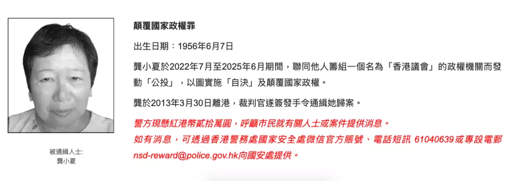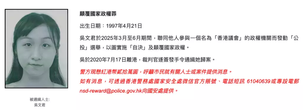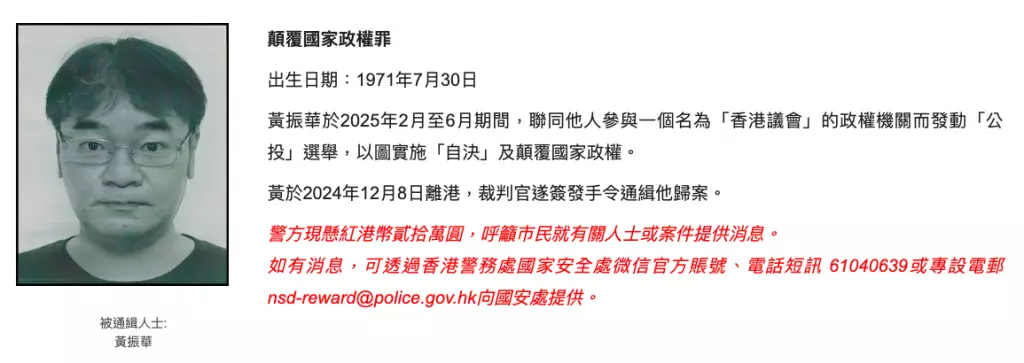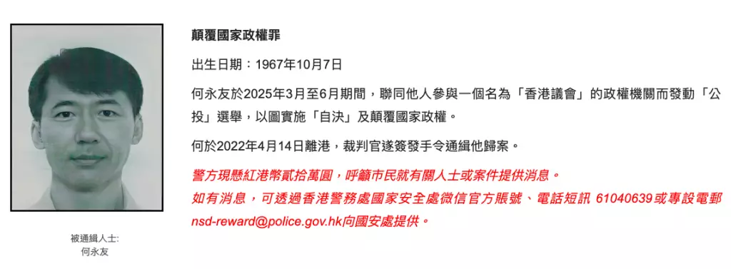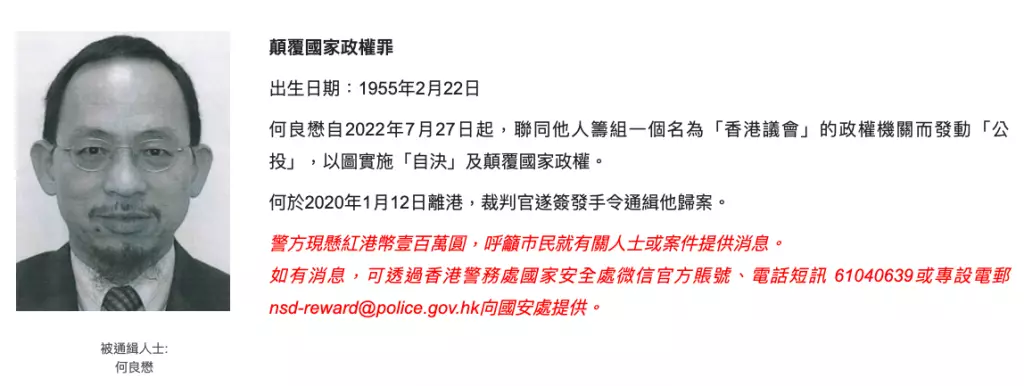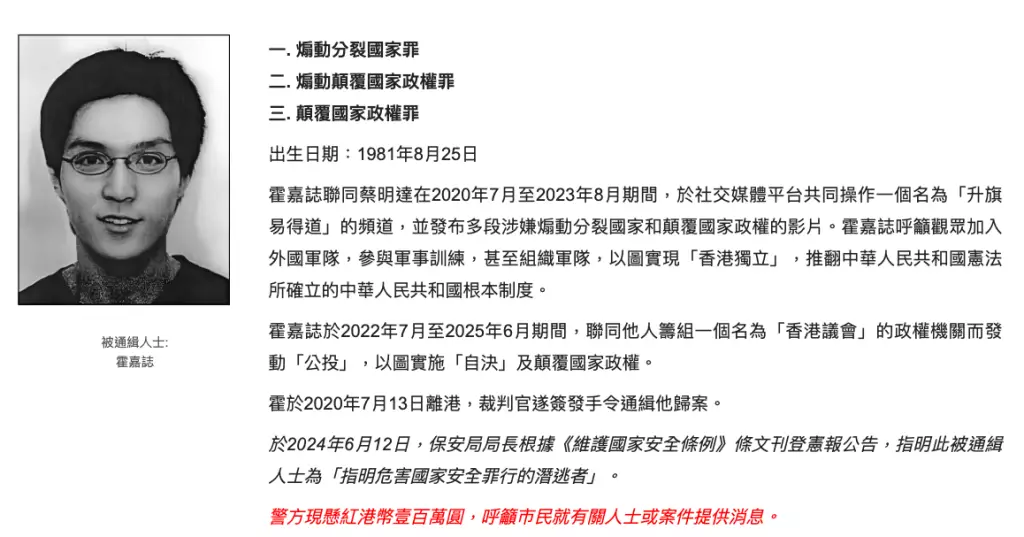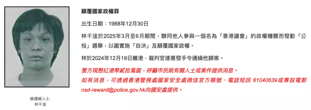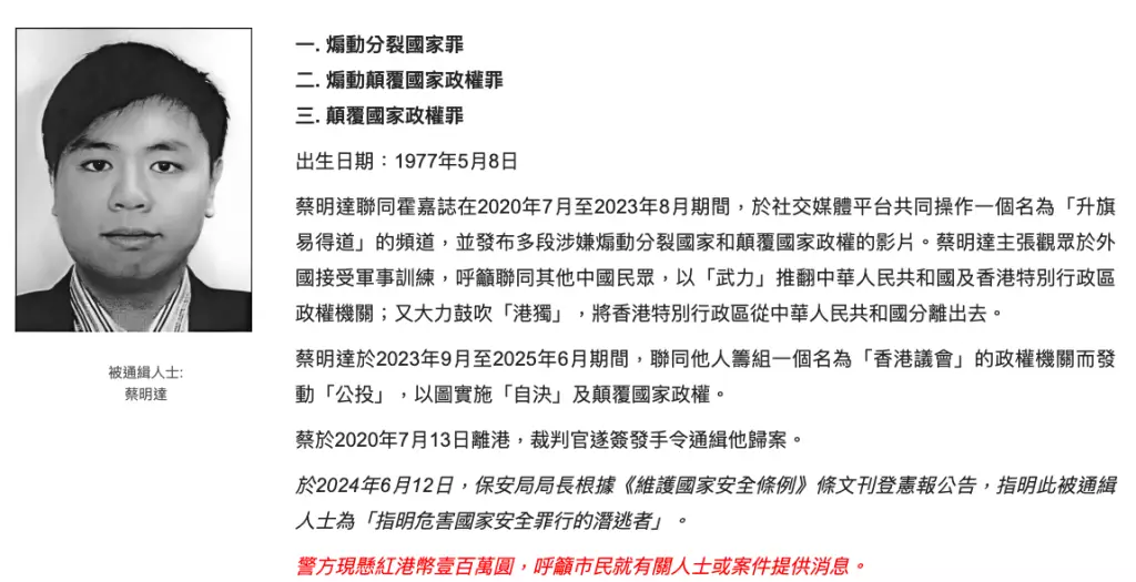 就上述在逃人士,當中袁弓夷、何良懋、霍嘉誌及蔡明達早前已因涉嫌干犯危害國家安全罪行各被警方懸紅港幣一百萬元通緝;保安局局長亦於二○二四年六月和十二月先後行使《維護國家安全條例》第八十九條所賦予的權力,刊憲指明袁弓夷、霍嘉誌及蔡明達為潛逃者,並指明針對他們而施行的措施。警方會繼續全力將被通緝人士緝拿歸案。