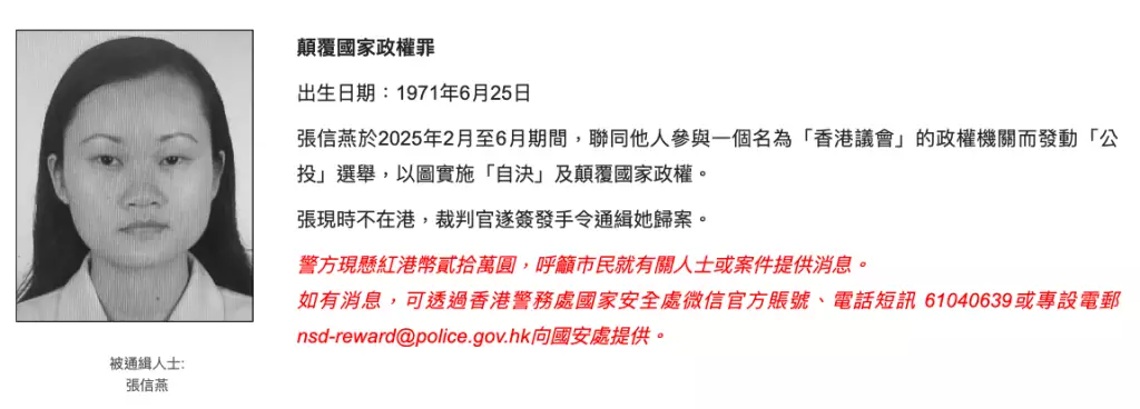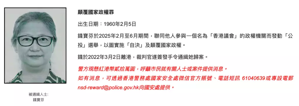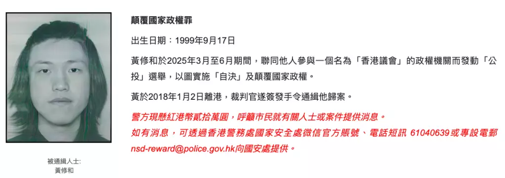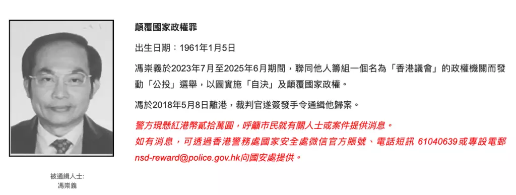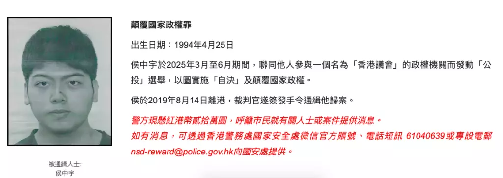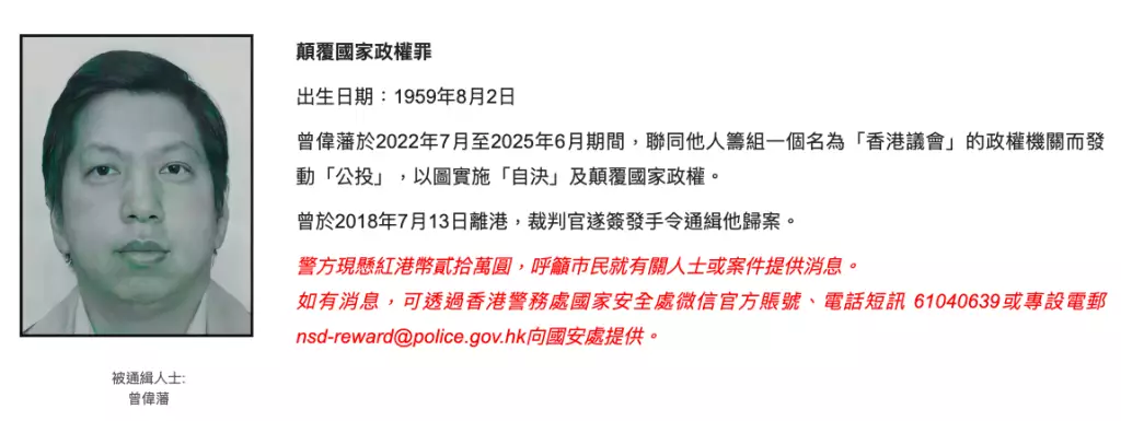 警務處國家安全處25日公布懸紅通緝19名在境外籌組、成立或參與一個名為「香港議會」的顛覆組織,涉嫌干犯《香港國安法》的「顛覆國家政權罪」。