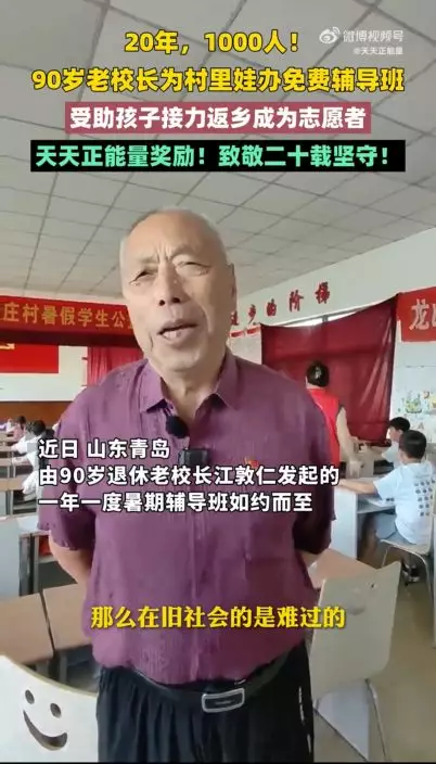 綜合內媒報導,青島市即墨區龍山街道西程哥莊村一間普通的文化大院內,於今年7月14日傳來孩子們清脆悅耳的讀書聲,與過去的20個夏天一樣,年屆9旬的退休校長江敦仁發起的免費暑託班再次開班,他與以往一樣走上熟悉的講台,為村內40多名小學生開啟新一年的暑期公益輔導班。
