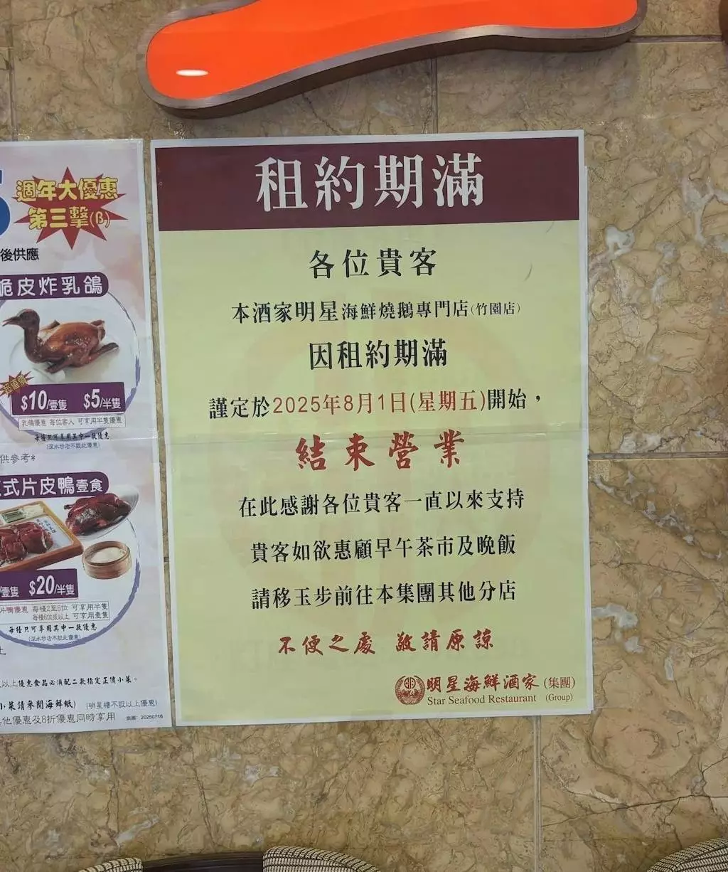 位於黃大仙竹園的明星海鮮酒家燒鵝專門店宣布,將於8月1日租約期滿結業,香港飲食業職工會聯合會表示關注,稱有員工遭公司拖糧。