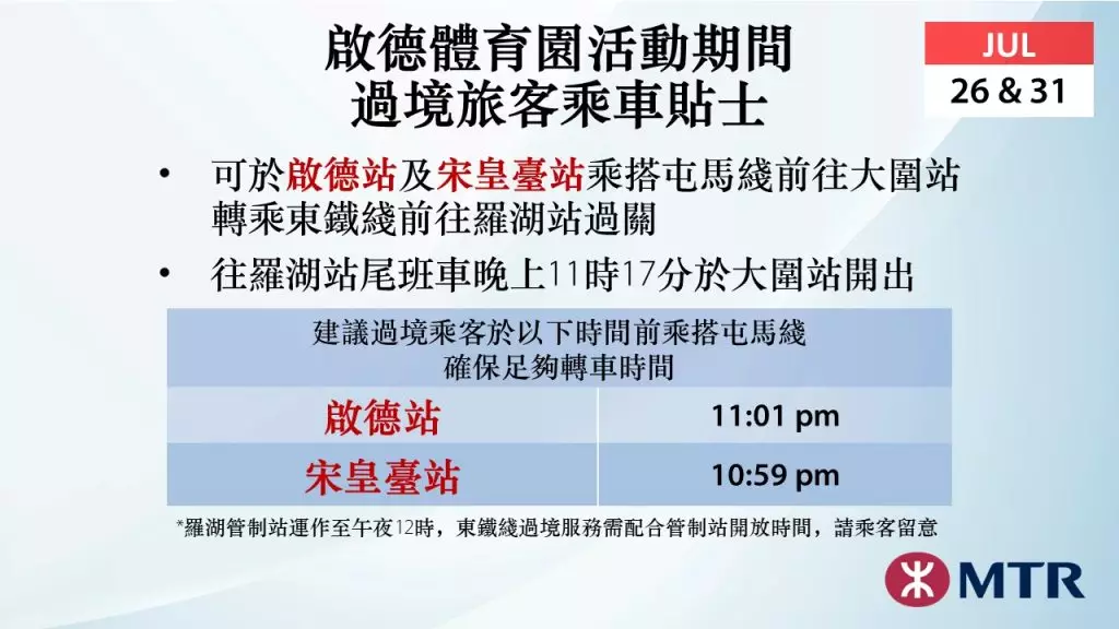 另外,過境旅客可於啟德或宋皇臺站乘搭屯馬綫前往大圍站,轉乘東鐵綫前往羅湖站過關。羅湖管制站運作至午夜12時,前往羅湖站的東鐵綫列車服務需配合相關開放時間。由於球賽預計接近晚上 10 時結束,港鐵公司提醒旅客留意相關尾班車時間,提早計劃行程及預留足夠轉車時間。